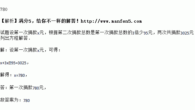 某校学生为灾区积极捐款.已知第二次捐款总数是第一次捐款总数的倍少元,两次共捐款元,则第一次捐款________元.