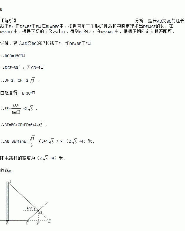 如图,直立于地面上的电线杆,在阳光下落在水平地面和坡面上的影子分别是.测得, , ,在D处测得电线杆顶端A的仰角为,则电线杆的高度 为( )