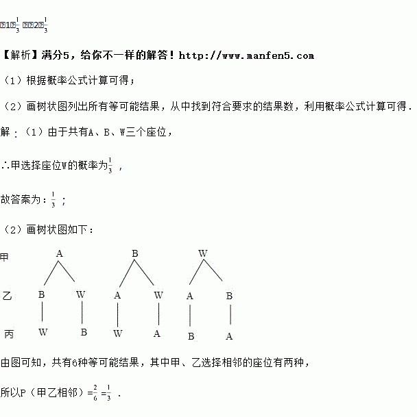 某天,甲、乙、丙三人一起乘坐公交车,他们上车时发现公交车上还有A,B,W三个空座位,且只有A,B两个座位相邻,若三人随机选择座位,试解决以下问题: