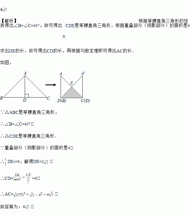 如图,等腰直角三角形ABC中,AD是底边BC上的高,现将△ABD沿DC方向平移,使点D和点C重合,若重叠部分(阴影部分)的面积是4,则△ABC的腰长为___________.