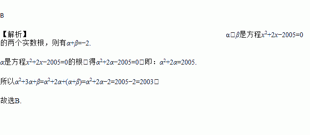 B 【解析】α、β是方程x2+2x?2005=0的两个实数根,则有α+β=?2. α是方程x2+2x?2005=0的根,得α2+2α?2005=0,即:α2+2α=2005. 所以α2+3α+β=α2+2α+(α+β)=α2+2α?2=2005?2=2003, 故选B.
