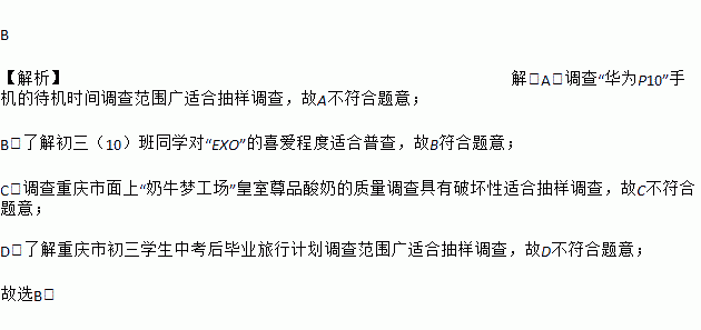 B 【解析】解:A.调查“华为P10”手机的待机时间调查范围广适合抽样调查,故A不符合题意; B.了解初三(10)班同学对“EXO”的喜爱程度适合普查,故B符合题意; C.调查重庆市面上“奶牛梦工场”皇室尊品酸奶的质量调查具有破坏性适合抽样调查,故C不符合题意; D.了解重庆市初三学生中考后毕业旅行计划调查范围广适合抽样调查,故D不符合题意; 故选B.
