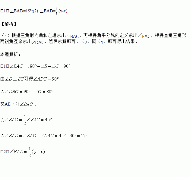 (2)设∠B=x,∠C=y(x<y).请直接写出∠DAE的度数 .(用含x,y的代数式表示)