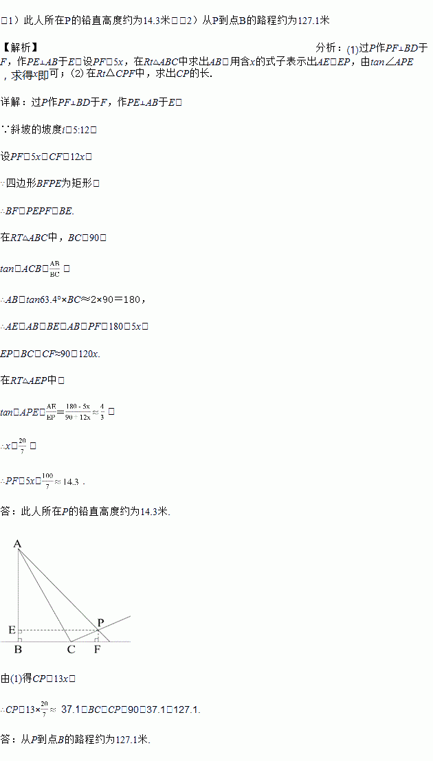 如图,某人在山坡坡脚C处测得一座建筑物顶点A的仰角为63.4°,沿山坡向上走到P处再测得该建筑物顶点A的仰角为53°.已知BC=90米,且B、C、D在同一条直线上,山坡坡度i=5:12.