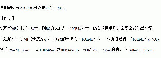 如图,要利用一面墙(墙长为25米)建羊圈,用100米的围栏围成总面积为400平方米的三个大小相同的矩形羊圈,求羊圈的边长AB,BC各为多少米?