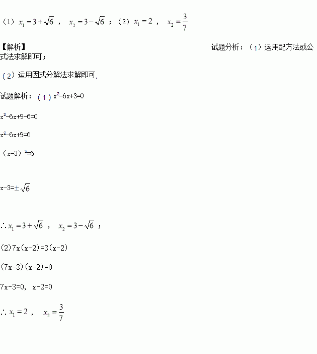 解方程:(1) x2-6x+3=0 (2)7x(x-2)=3(x-2)