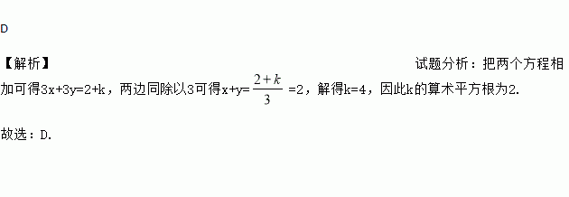 已知方程组的解满足x+y=2,则k的算术平方根为( ).