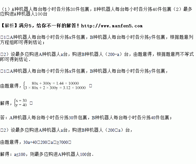 科技改变世界.2017年底,快递分拣机器人从微博火到了朋友圈,据介绍,这些机器人不仅可以自动规划最优路线,将包裹准确地放入相应的格口,还会感应避让障碍物,自动归队取包裹.没电的时候还会自己找充电桩充电.某快递公司启用80台A种机器人、300台B种机器人分拣快递包裹.A,B两种机器人全部投入工作,1小时共可以分拣1.44万件包裹,若全部A种机器人工作3小时,全部B种机器人工作2小时,一共可以分拣3.12万件包裹.