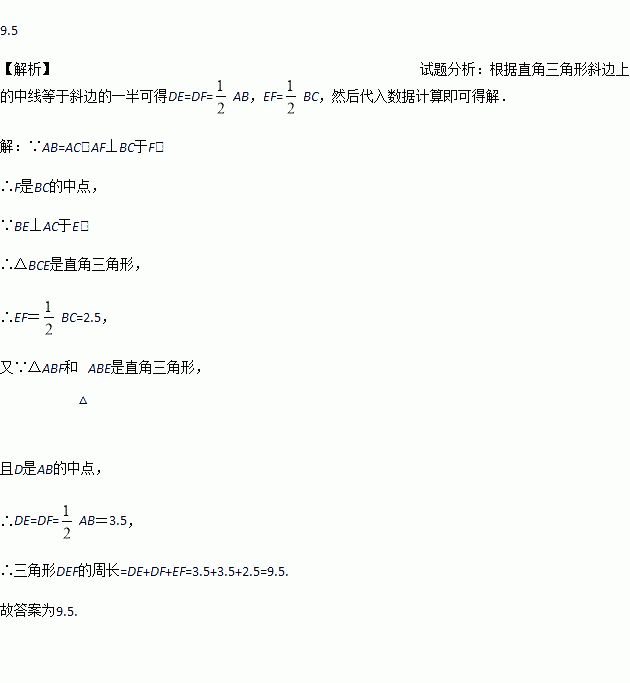 如图,在△ABC中,AB=AC=7,BC=5,AF⊥BC于F,BE⊥AC于E,D是AB的中点,则△DEF的周长是____________.