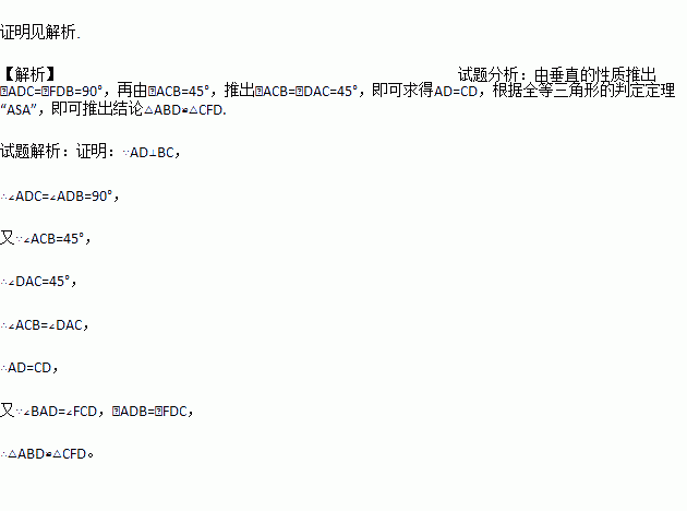 已知:如图,△ABC中,∠ACB=45°,AD⊥BC于D,CF交AD于点F,连接BF并延长交AC于点E,∠BAD=∠FCD.求证:△ABD≌△CFD.