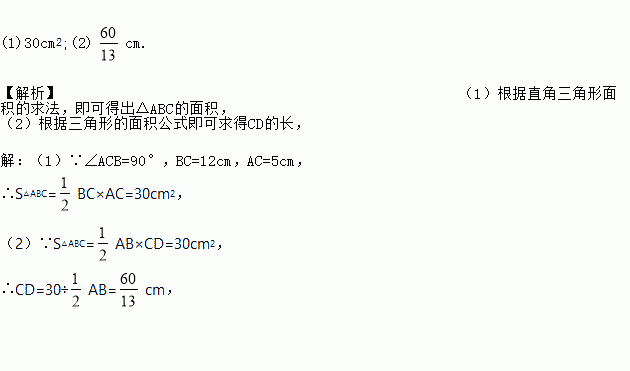 如图,在△ABC中,∠ACB=90°,CD是AB边上的高,AB=13cm,BC=12cm,AC=5cm,求:(1)△ABC的面积;(2)CD的长.