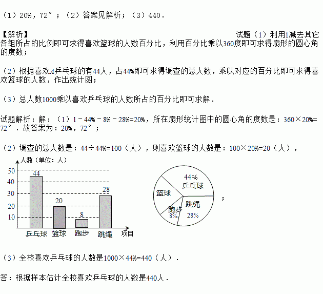 (3)已知该校有1000名学生,根据样本估计全校喜欢乒乓球的人数是多少?