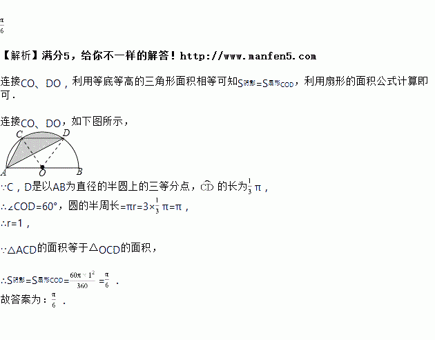 如图,点、是以为直径的半圆的三等分点,的长为,则图中阴影部分的面积为________.(结果不取近似值)