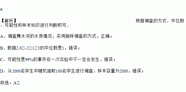 A. 调查舞水河的水质情况,采用抽样调查的方式