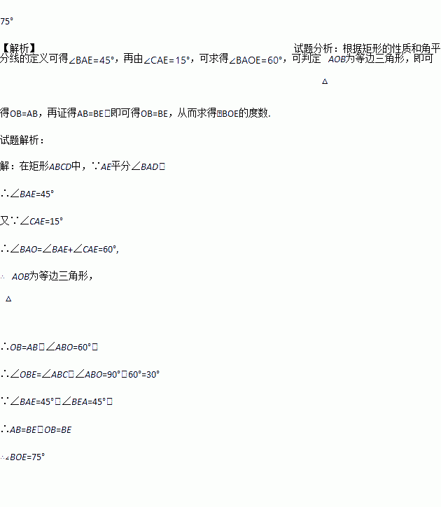 如图,在矩形ABCD中,AC、BD相交于O,AE平分∠BAD,交BC于E,若∠CAE=15°,求∠BOE的度数.