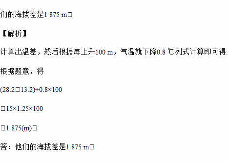 2017年“十一”国庆假期间,万彬和温权听到各自的父母都将带他们去黄山旅游,他们听到后立即上网查资料,资料显示:高山气温一般每上升100 m,气温就下降0.8 ℃.10月2日上午10点,万彬在黄山顶,温权在黄山脚下.他们用手机通话,同时测出他们所在位置气温,分别是13.2 ℃和28.2 ℃,因而,他们就推算出这时候彼此所在地的海拔差.你知道他们是怎么算出的吗?他们的海拔差是多少?