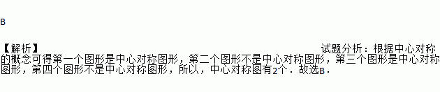 B 【解析】试题分析:根据中心对称的概念可得第一个图形是中心对称图形,第二个图形不是中心对称图形,第三个图形是中心对称图形,第四个图形不是中心对称图形,所以,中心对称图有2个.故选B.
