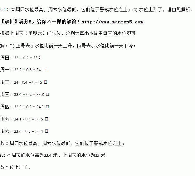下表记录的是流花河今年某一周内的水位变化情况,上周末(星期六)的水位已达到警戒水位米.(正号表示水位比前一天上升,负号表示水位比前一天下降)![]()