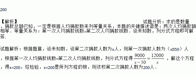 200 【解析】试题分析:求的是数量,捐款总额已知,一定是根据人均捐款数来列等量关系,本题的关键描述语是:两次人均捐款额相等.等量关系为:第一次人均捐款钱数=第二次人均捐款钱数.设未知数,列分式方程即可解答. 试题解析:根据题意,设未知数,设第二次捐款人数为x人,则第一次捐款人数为(x﹣50)人,根据第一次人均捐款钱数=第二次人均捐款钱数,列分式方程得,解这个方程,得x=200,经检验...