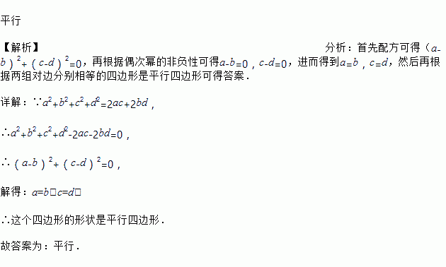 已知a、b、c、d为四边形的四边长,a、c为对边,且满足a2+b2+c2+d2=2ac+2bd,则这个四边形一定是______四边形.