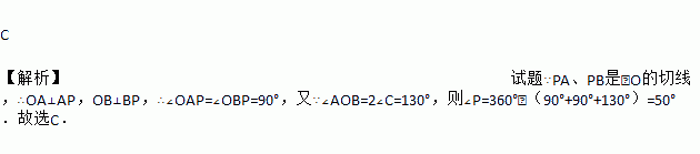 如图,PA,PB分别与⊙O相切于A,B两点,若∠C=65°,则∠P的度数为( )