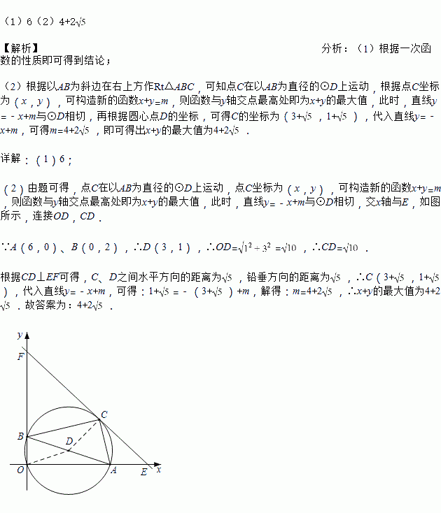 (1)如图1,在平面直角坐标系中,已知点A、B的坐标分别为A(6,0)、B(0,2),点C(x,y)在线段AB上,计算(x+y)的最大值。小明的想法是:这里有两个变量x、y,若最大值存在,设最大值为m,则有函数关系式y=-x+m,由一次函数的图像可知,当该直线与y轴交点最高时,就是m的最大值,(x+y)的最大值为 ;