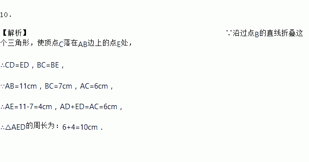 Èçͼ£¬Èý½ÇÐÎֽƬABC£¬AB=11cm£¬BC=7cm£¬AC=6cm£¬ÑعýµãBµÄÖ±ÏßÕÛµþÕâ¸öÈý½ÇÐΣ¬Ê¹¶¥µãCÂäÔÚAB±ßÉϵĵãE´¦£¬ÕÛºÛΪBD£¬Ôò¡÷AEDµÄÖܳ¤Îª________cm£®