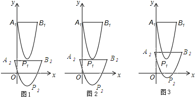 (3)我们把问题(1)③中抛物线y=2(x-2)2+3对应的燕尾形,记为“燕尾1”,相应点记为A1、B1、P1,它在坐标系中的位置如图2所示,把问题(2)③中抛物线y=ax2-4ax+c(c>0)对应的燕尾形,记为“燕尾2”,相应点记为:A2、B2、P2.