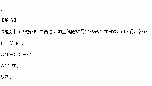 C. 【解析】 试题分析:根据AB=CD两边都加上线段BC得出AB+BC=CD+BC,即可得出答案. 【解析】 ∵AB=CD, ∴AB+BC=CD+BC, ∴AC=BD, 故选C.