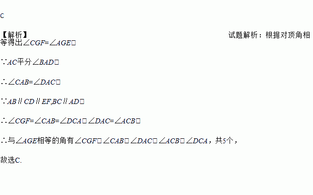 如图所示,AB∥CD∥EF,BC∥AD,AC平分∠BAD,则图中与∠AGE相等的角(不包括∠AGE本身)有( )