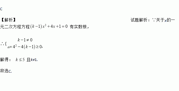 C 【解析】试题解析:∵关于x的一元二次方程方程有实数根, ∴ 解得: 且k≠1. 故选C.