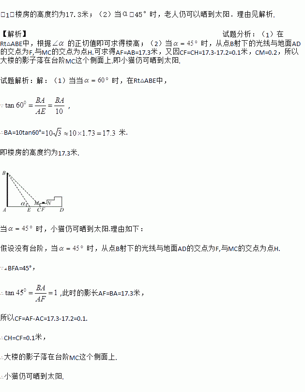 如图所示,一幢楼房AB背后有一台阶CD,台阶每层高0.2米,且AC=17.2米,设太阳光线与水平地面的夹角为α,当α=60°时,测得楼房在地面上的影长AE=10米,现有一老人坐在MN这层台阶上晒太阳.(