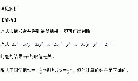 有这样一道题:计算(2x3-3x2y-2xy2)-(x3-2xy2+y3)+(-x3+3x2y-y3)的值,其中x=-