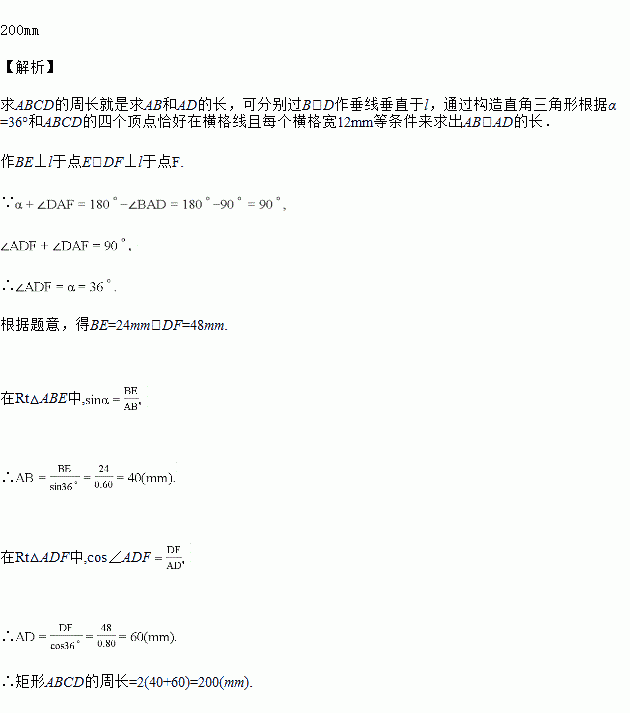 如图,把一张长方形卡片ABCD放在每格宽度为12mm的横格纸中,恰好四个顶点都在横格线上.已知α=36°,求长方形卡片的周长.