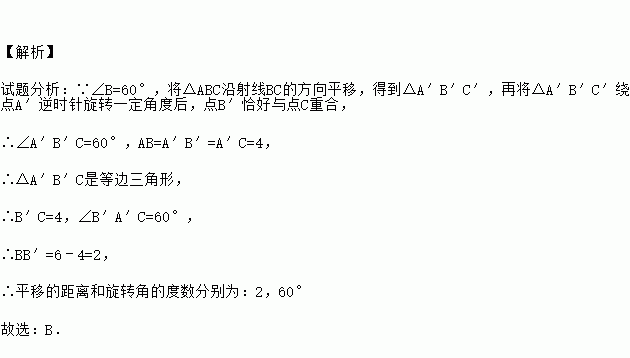 如图,△ABC中,AB=4,BC=6,∠B=60°,将△ABC沿射线BC的方向平移,得到△A′B′C′,再将△A′B′C′绕点A′逆时针旋转一定角度后,点B′恰好与点C重合,则平移的距离和旋转角的度数分别为( )