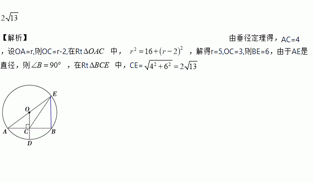 如图,⊙O的半径OD⊥弦AB于点C,连接AO并延长交⊙O于点E,连结EC.若AB=8,CD=2,则EC的长为 .