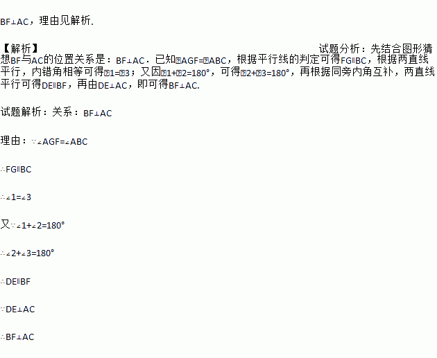 已知如图,DE⊥AC,∠AGF=∠ABC,∠1+∠2=180°,试判断BF与AC的位置关系,并说明理由.