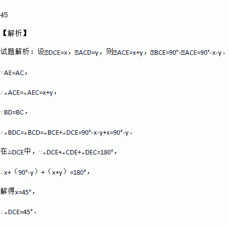 如图,在Rt△ABC中,D,E为斜边AB上的两个点,且BD=BC,AE=AC,则∠DCE的大小等于__________度.