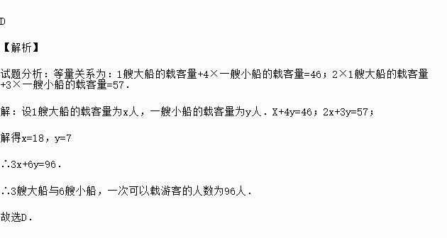 有大小两种船,1艘大船与4艘小船一次可以载乘客46名,2艘大船与3艘小船一次可以载乘客57人.某船家有3艘大船与6艘小船,一次可以载游客的人数为( )