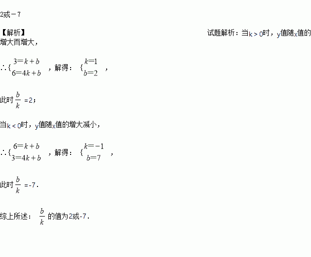 一次函数y=kx+b,当1≤x≤4时,3≤y≤6,则的值是________.