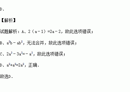 A.2(a﹣1)=2a﹣1 B.a2b﹣ab2=0 C.2a3﹣3a3=a3 D.a2+a2=2a2