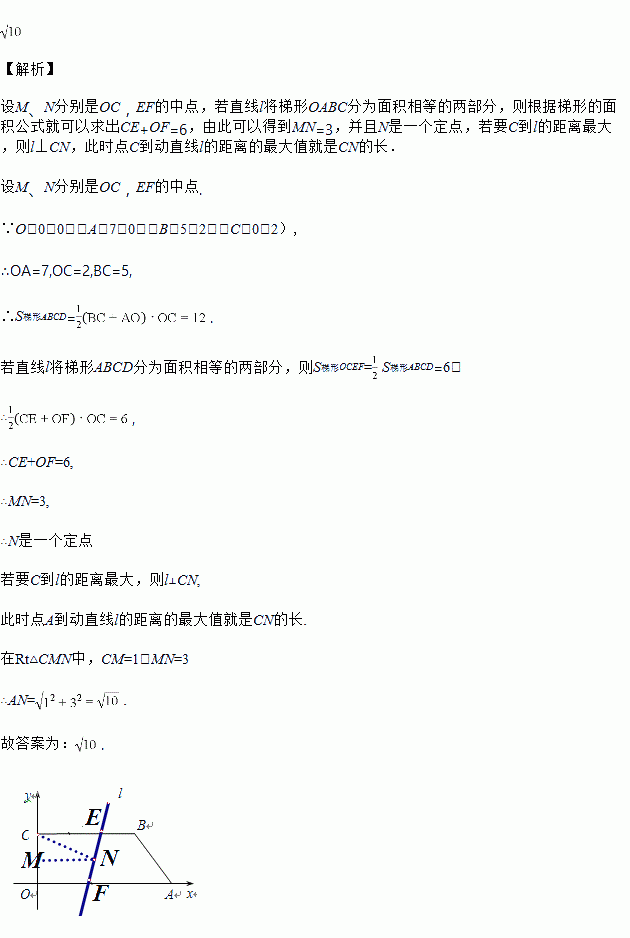 如图,在直角坐标系中,O(0,0),A(7,0),B(5,2),C(0,2)一条动直线l分别与BC、OA交于 点E、F,且将四边形OABC分为面积相等的两部分,则点C到动直线l的距离的最大值为____,