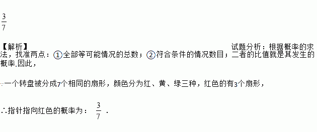 如图,一个转盘被分成7个相同的扇形,颜色分为红、黄、绿三种,指针的位置固定,转动转盘后任其自由停止,其中时某个扇形会恰好停在指针所指的位置(指针指向两个扇形的交线时,当作指向右边的扇形),则指针指向红色的概率为___________.