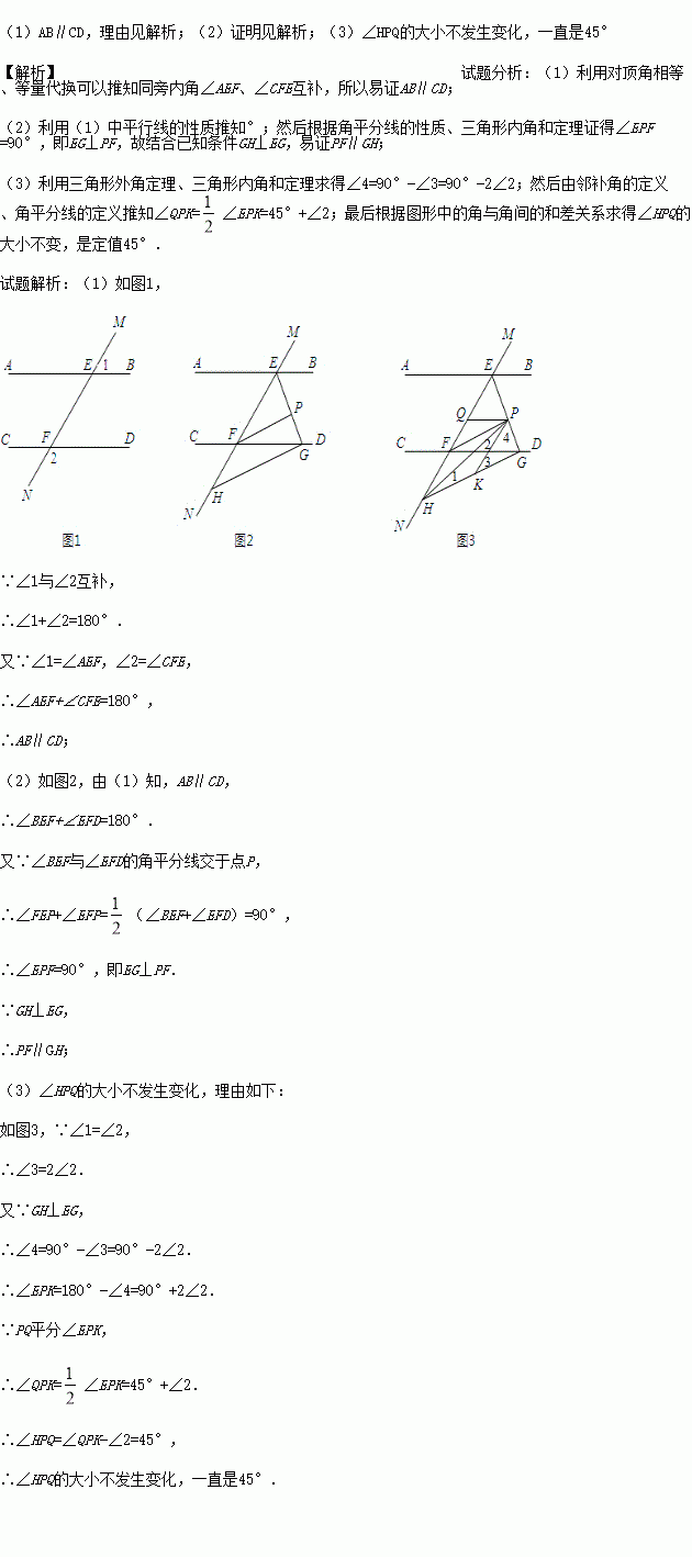 (3)如图3,在(2)的条件下,连接PH,K是GH上一点使∠PHK=∠HPK,作PQ平分∠EPK,问∠HPQ的大小是否发生变化?若不变,请求出其值;若变化,说明理由.