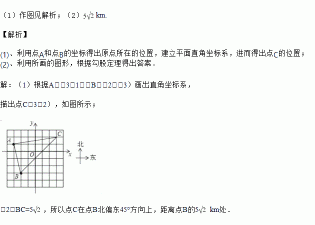 在一次夏令营活动中,老师将一份行动计划藏在没有任何标记的点C处,只告诉大家两个标志点A,B的坐标分别为(﹣3,1)、(﹣2,﹣3),以及点C的坐标为(3,2)(单位:km).