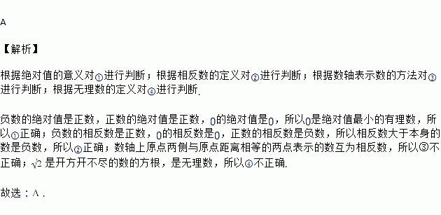 ①0是绝对值最小的有理数;②相反数大于本身的数是负数;③数轴上原点两侧的数互为相反数;是有理数.