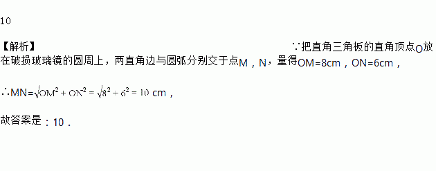 如图,把直角三角板的直角顶点O放在破损玻璃镜的圆周上,两直角边与圆弧分别交于点M,N,量得OM=8cm,ON=6cm.则该圆玻璃镜的直径是_____cm.