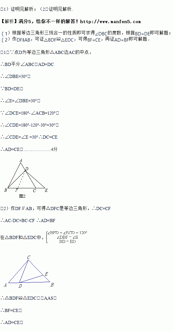 (1)如图,若点D为线段AC的中点,求证:AD=CE;