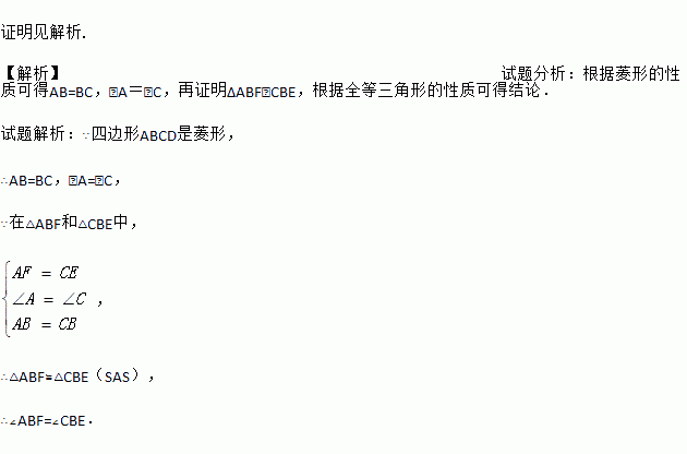 如图,点E,F分别在菱形ABCD的边DC,DA上,且CE=AF.求证:∠ABF=∠CBE.