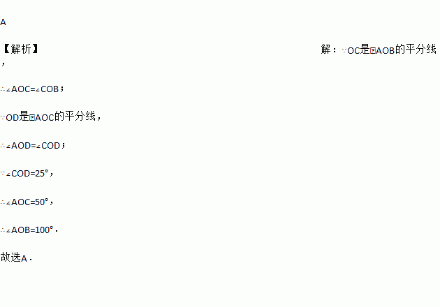 A 【解析】【解析】 ∵OC是∠AOB的平分线, ∴∠AOC=∠COB; ∵OD是∠AOC的平分线, ∴∠AOD=∠COD; ∵∠COD=25°, ∴∠AOC=50°, ∴∠AOB=100°. 故选A.